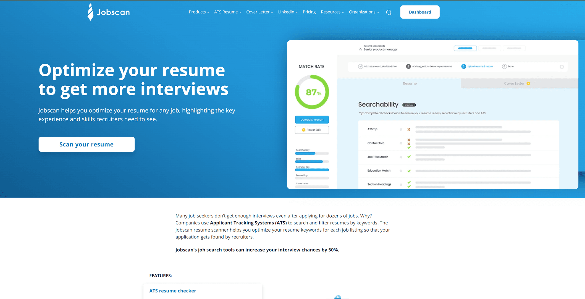 Jobscan is a premier online resource that refines your resume and LinkedIn profile to align precisely with job descriptions. Its AI-powered system swiftly assesses the compatibility of your resume with a job's requirements and suggests improvements. Jobscan streamlines the customization of your resume, enhancing its visibility to recruiters and aiding its navigation through ATS systems. It also offers templates for resumes and cover letters, a job tracking board, and a variety of other resources to assist your job search process.