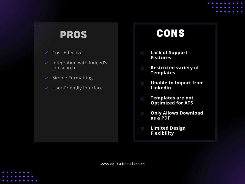 Indeed's Resume Builder is a top choice for creating professional resumes. It offers a variety of ATS-friendly templates suitable for job seekers at any career level. The platform's user-friendly drag-and-drop interface simplifies resume design and is available worldwide, with a strong presence in over 60 countries, notably the US. It requires no registration and is free to use, making it a user-friendly tool. Moreover, Indeed exceeds mere resume creation with its extensive database and advanced candidate tracking, offering a comprehensive solution for both job seekers and employers. This makes Indeed stand as an appealing choice for those looking to enhance their job application process.