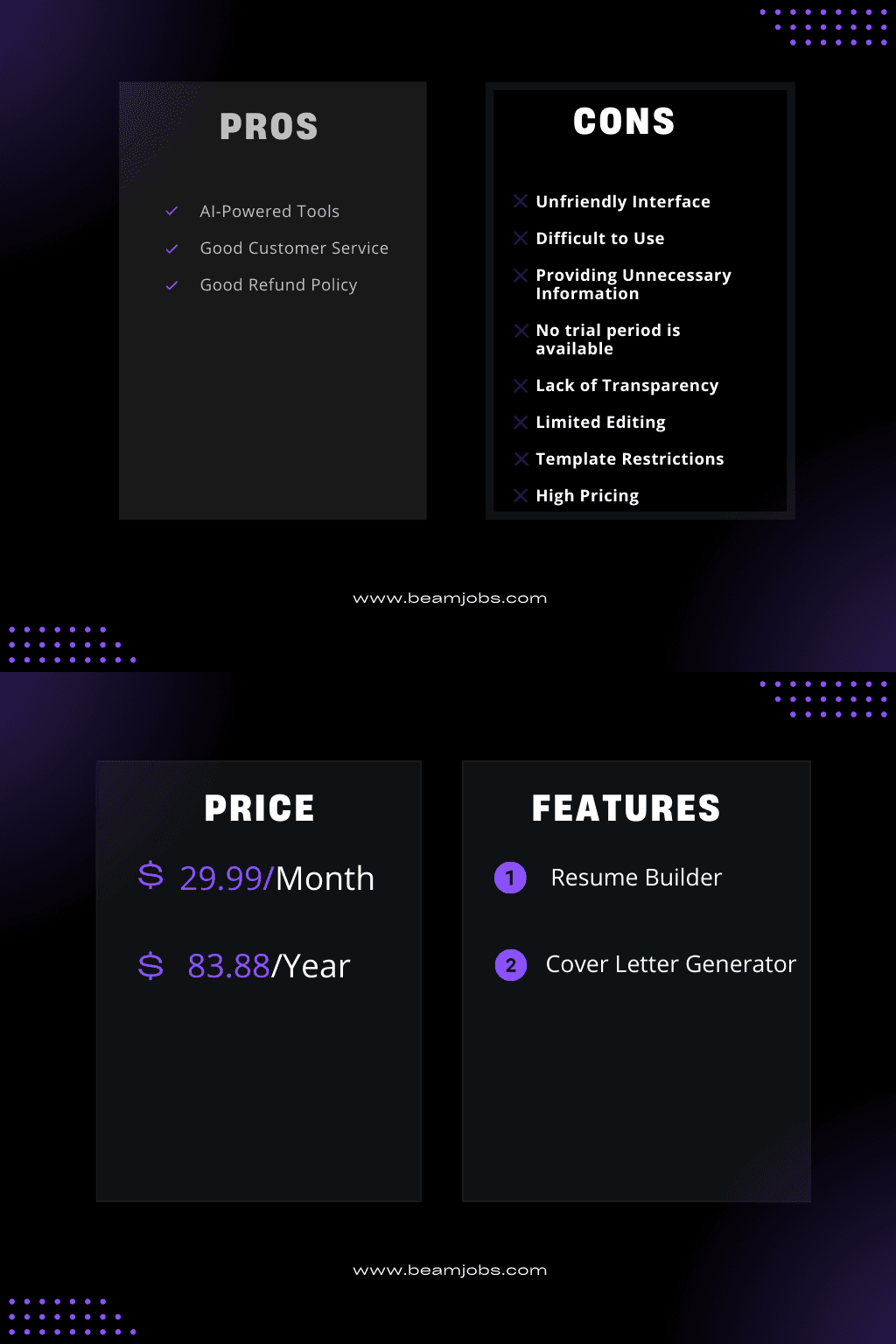 BeamJobs.com is an online resume builder service designed to simplify the process of creating professional and visually appealing resumes. It provides a user-friendly interface and a variety of customizable templates suitable for different industries and job roles. Users can easily input their personal information, work experience, education, skills, and achievements into specific sections, ensuring a well-structured and organized layout. Their tools allow users to create or update a resume, even without prior resume-writing experience. The platform also provides a score and suggestions for improvements as you work on your resume, enhancing your resume-building skills over time.