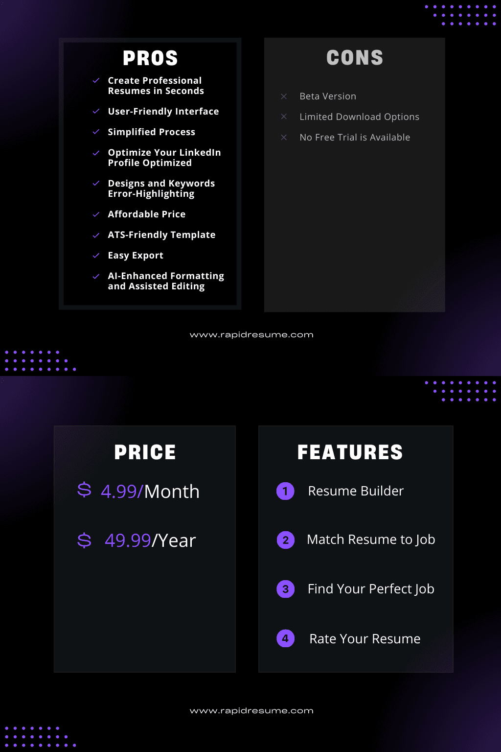 The top picks below are based on our genuine experiences with various resume-builder services in the market, which include both paid and free options. We have already outlined the advantages and disadvantages of each for your consideration. Feel free to explore and choose the ideal resume builder for you from this list.1. Rapid Resume