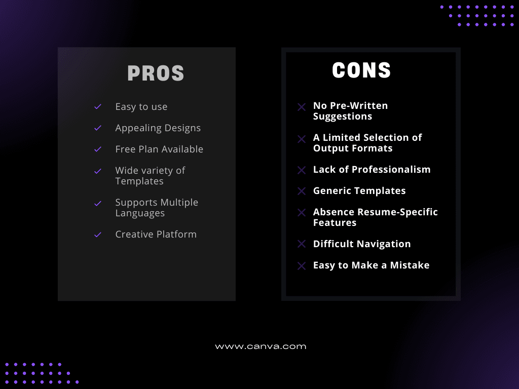 Canva Resume Builder is a user-friendly online tool geared towards crafting personalized, professional resumes. It provides a broad range of templates and customization options, enabling users to add unique elements to their resumes. Although it lacks expert tips or resume scoring, it makes up for these with features such as PDF editing, video editing, and image manipulation tools.Acknowledged globally as a dependable resource for job applicants, particularly in the tech industry, Canva has revolutionized visual communication and design engagement.It offers both free and premium versions with diverse templates to cater to various preferences. In addition to resumes, Canva's comprehensive platform also assists in creating other materials like cover letters and portfolios, thus promoting a unified personal branding strategy.