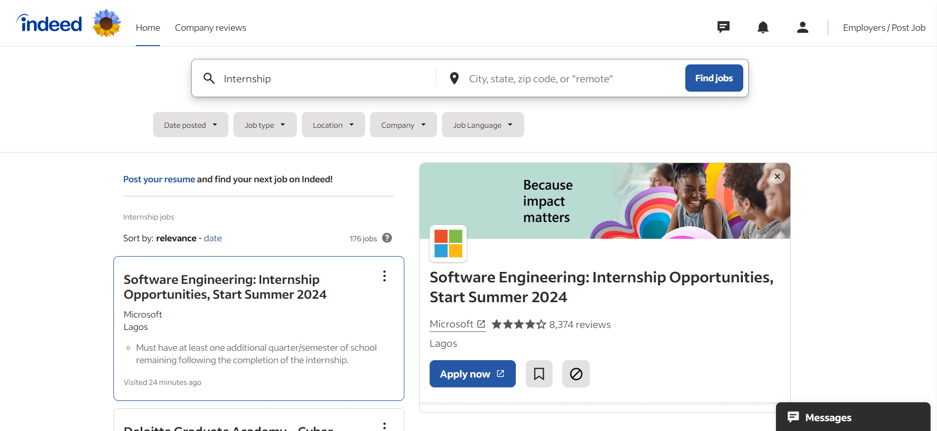 Indeed, holds a leading position in the job search industry. As a massive job search engine, it does not limit its scope to any specific sector or region. Instead, it lists internships across various industries from every corner of the world, earning its well-deserved reputation as one of the largest job boards on the internet. The website is designed with a user-friendly interface that simplifies the task of searching for the perfect internship. This platform gives you access to millions of unique job and internship opportunities. You'll likely find more options here than anywhere else. Its intuitive design and easy-to-use search tools make it an excellent place to start your search.Finding the ideal internship may take some time, so tailor your search filters to get the best results. Indeed, caters to all types of job seekers by accommodating searches for full-time, part-time, contract-based, freelance, and internship positions. The platform is equipped with various filters designed to refine your job search. For instance, you can define your desired job title, specify a preferred salary range, and set a preferred location - all of which help you find jobs that align perfectly with your interests and career goals.Besides, it also offers the convenience of saving your searches. This feature allows you to revisit your previous searches without having to enter the same parameters again. You can also opt to receive notifications of new internships and job opportunities directly to your email account. This ensures that you don't miss out on any promising opportunities that might align with your career objectives.