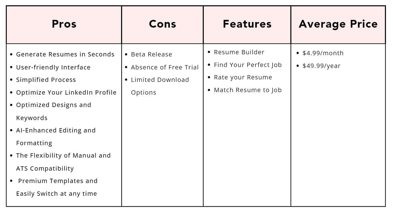 The most apparent downside of free resume builders is the presence of limited features and functionalities. This restriction becomes more evident when compared to the more comprehensive offerings of paid versions. In free versions, users are likely to experience limited template choices, fewer formatting options, and restricted access to premium features like cover letter creation or LinkedIn optimization.In contrast, paid resume services usually offer a broader range of features and customization options. These services may even include access to premium templates, unlimited downloads, and personalized support from cutting-edge AI technology.#2. Presence of Branding and Watermarks