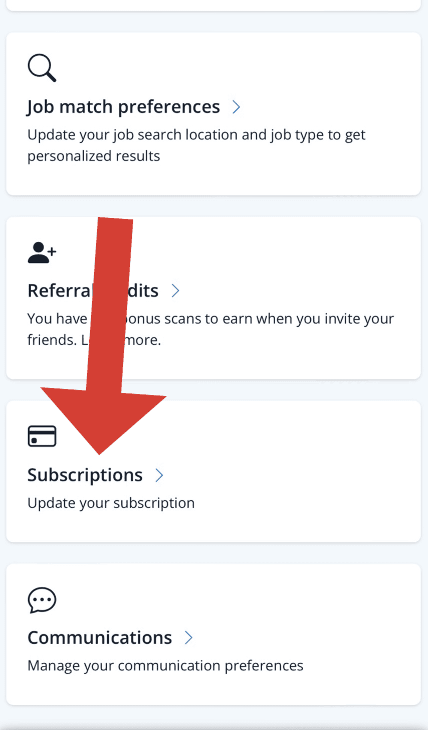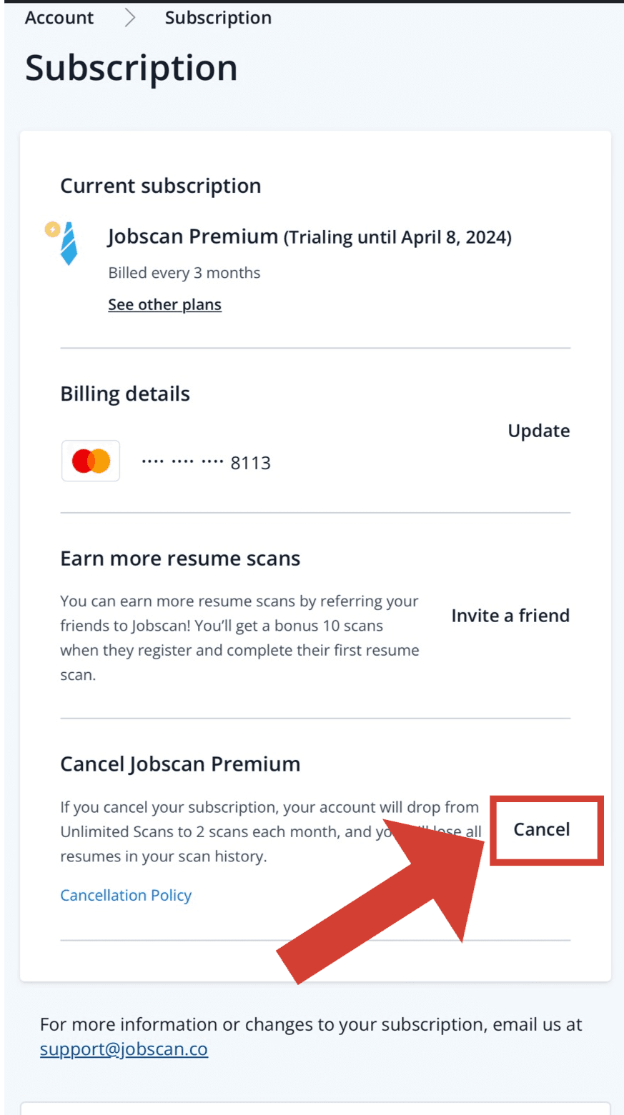 At the “Subscription” interface. Look at the words "Cancel Jobscan Premium" and click "Cancel" on the right corner of the screen.
